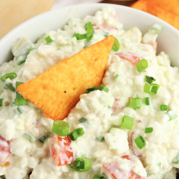 This is the perfect dip for cottage cheese lovers! The tangy flavors play really well with the avocado, tomatoes, and garlic and onion.
